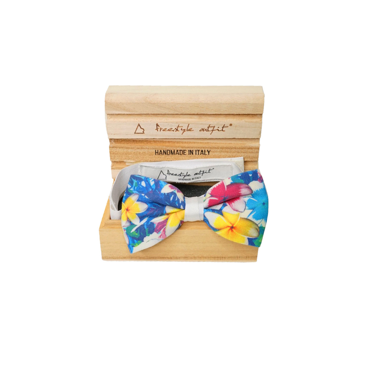 Papillon blu floreale in cotone, modello artigianale realizzato in laboratorio di alta sartoria. Ideale per chi vuole far notare il proprio look.