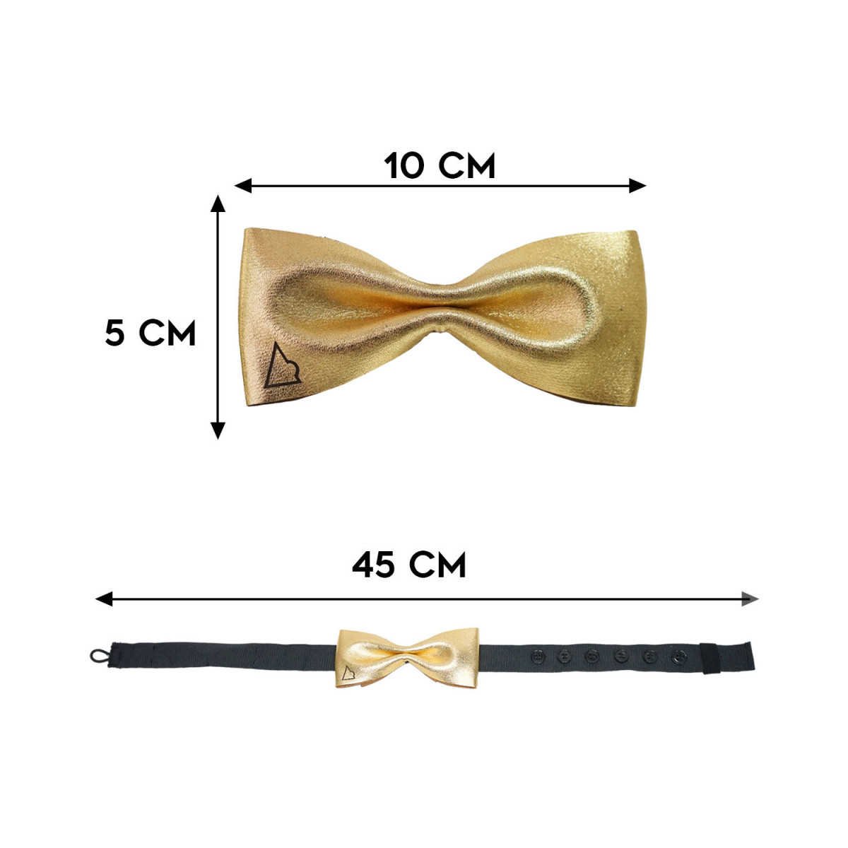 Realizzato a mano questo meraviglioso papillon in vera pelle laminata oro con la sua forma non convenzionale dona carattere al tuo stile e il colore oro lo rende elegante e ideale per tutte le occasioni più speciali.